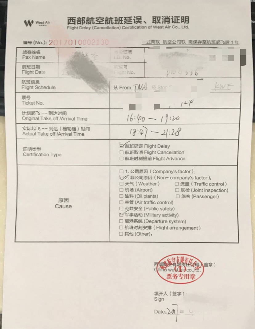 孫竟澤(化名)提供的西部航空公司航班延誤、取消證明 ,其中有航空公司編號,且蓋有公章,他認為偽造的可能性小。 受訪(fǎng)者供圖